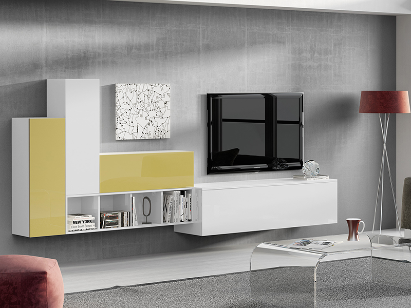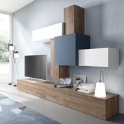 Два остекленных стеллажа, ТВ-тумба, комод, журнальный стол, подвесные полки.