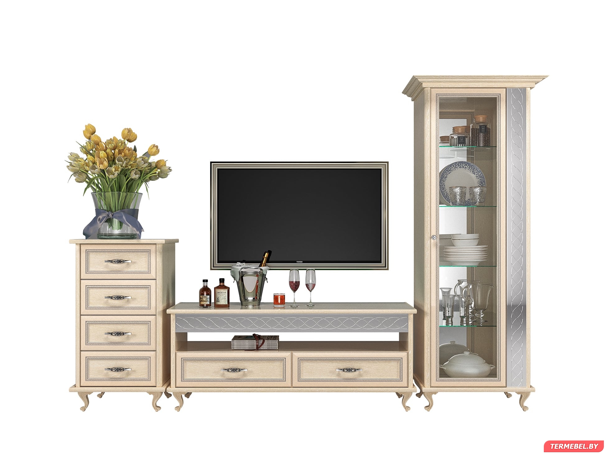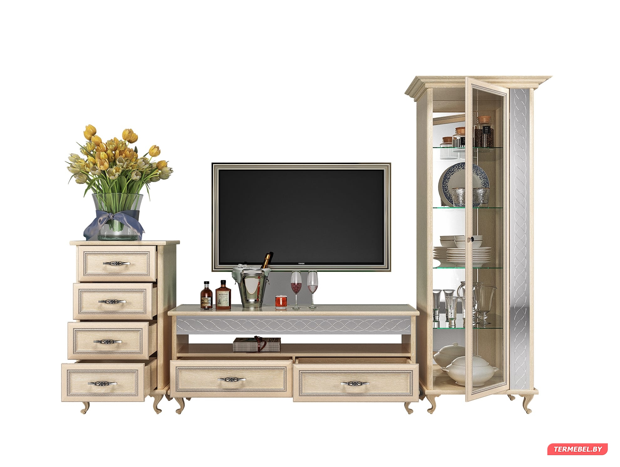 В комплекте: пенал со стеклом, шкаф платяной, полка закрытая, тумба ТВ.
