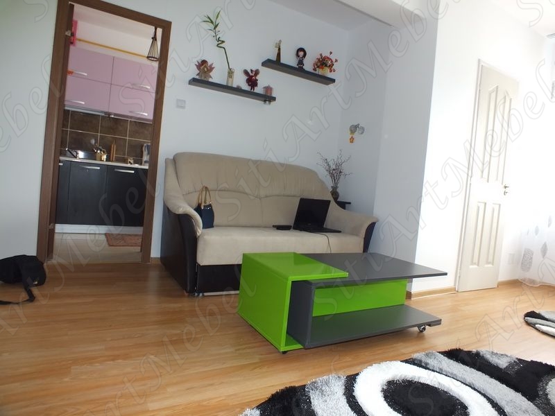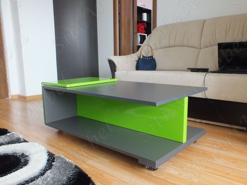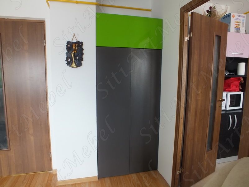 Стильный набор мебели — отличное решение для обустройства современной гостиной комнаты. В комплекте: тумба для ТВ с выдвижными ящиками, подвесной модуль с множеством отделов, оригинальный столик на колесиках и встроенный шкаф-купе. Зеленый фасад мебели освежит вашу комнату, добавив оригинальную нотку в интерьер.