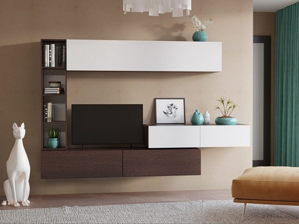 Современный набор мебели для гостиной с тумбой и шкафчиками. Выполнен в черно-белом цветовом исполнении.