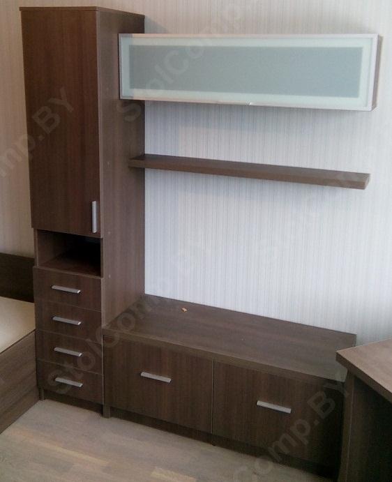 Небольшая горка из тумбы под ТВ, пеналов и навесной полки подойдет для размещения в ограниченной пространстве спальни или детской.