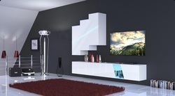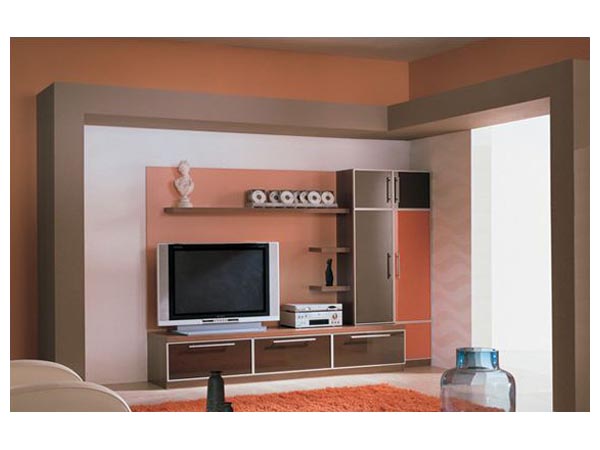 Компактный трехцветный вариант для гостиной с двумя маленькими и одной большой полкой. Прекрасно впишется в интерьер, не выбиваясь на первый план. Скромная и стильная.
