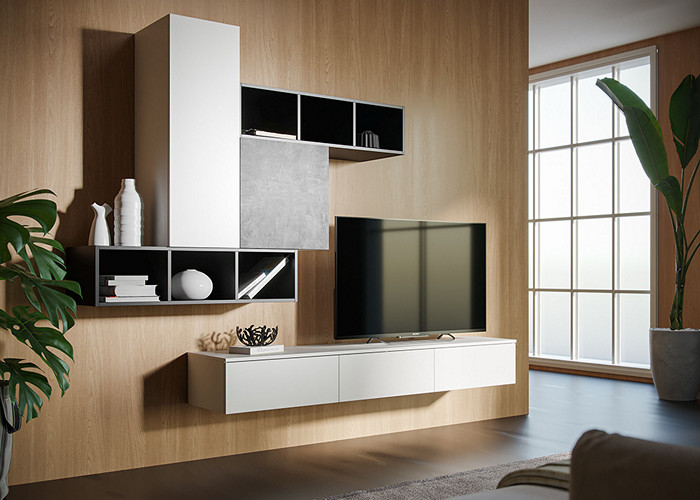 Модульный набор мебели с белыми глянцевыми фасадами в гостиную. Материал: МДФ покрытый плёнкой, ЛДСП.