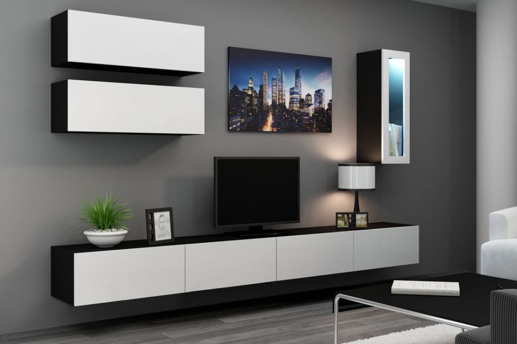 Гостиная в черном и белом цветах. Тумба для ТВ на ножках. Современный стиль.