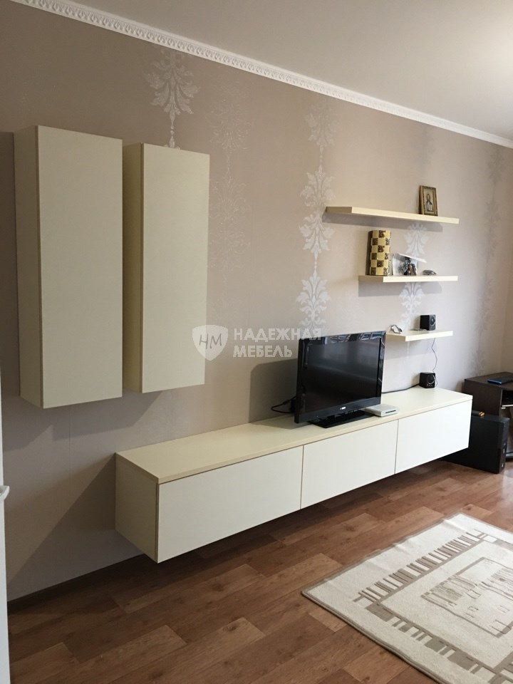 Два остекленных стеллажа, ТВ-тумба, комод, журнальный стол, подвесные полки.