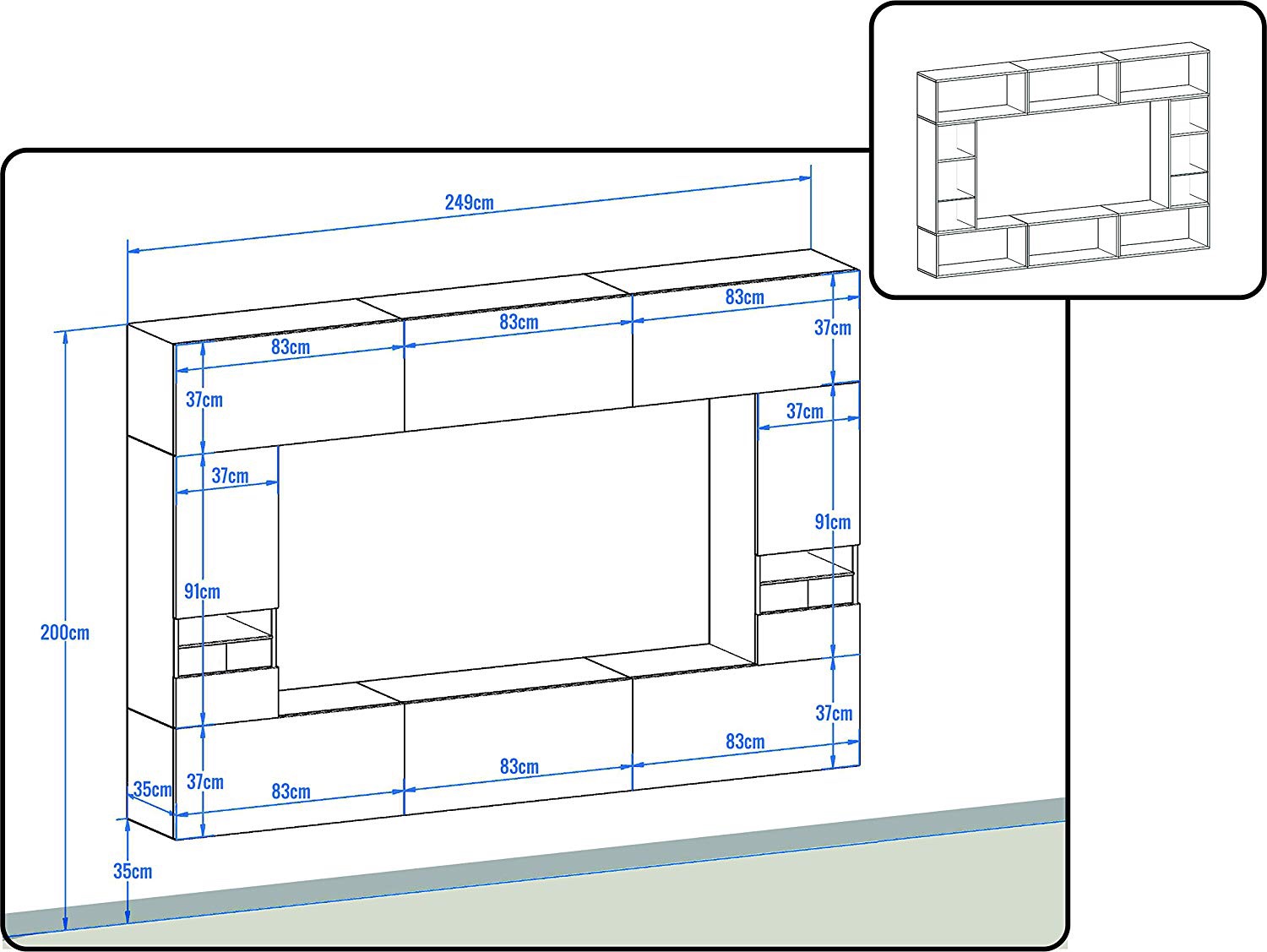 Ровная прямоугольная стенка с расположенными строго по периметру ящиками. Конструкция формирует четкий прямоугольник с нишей в центральной части. По обе стороны добавлены остекленные ящики.