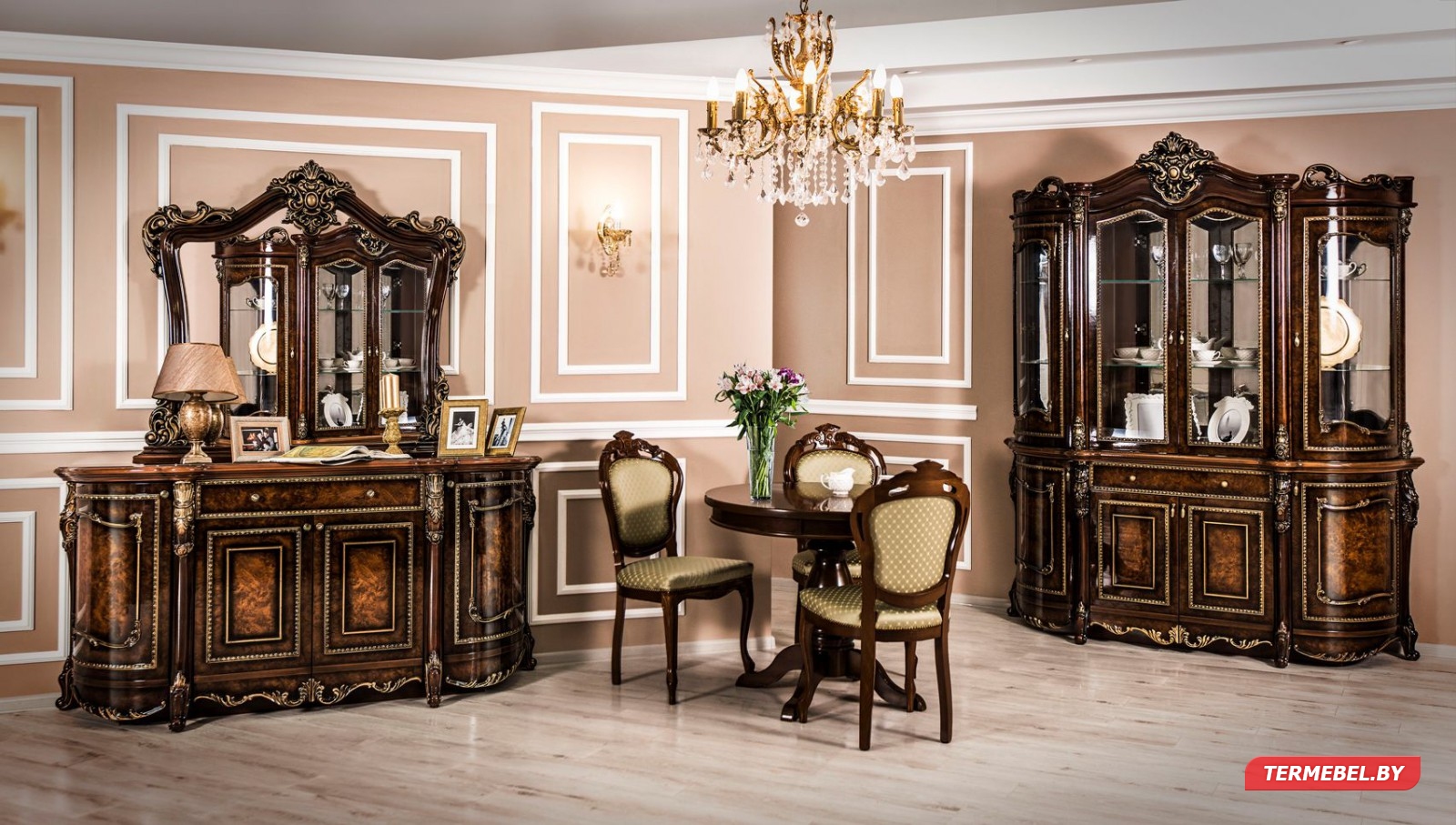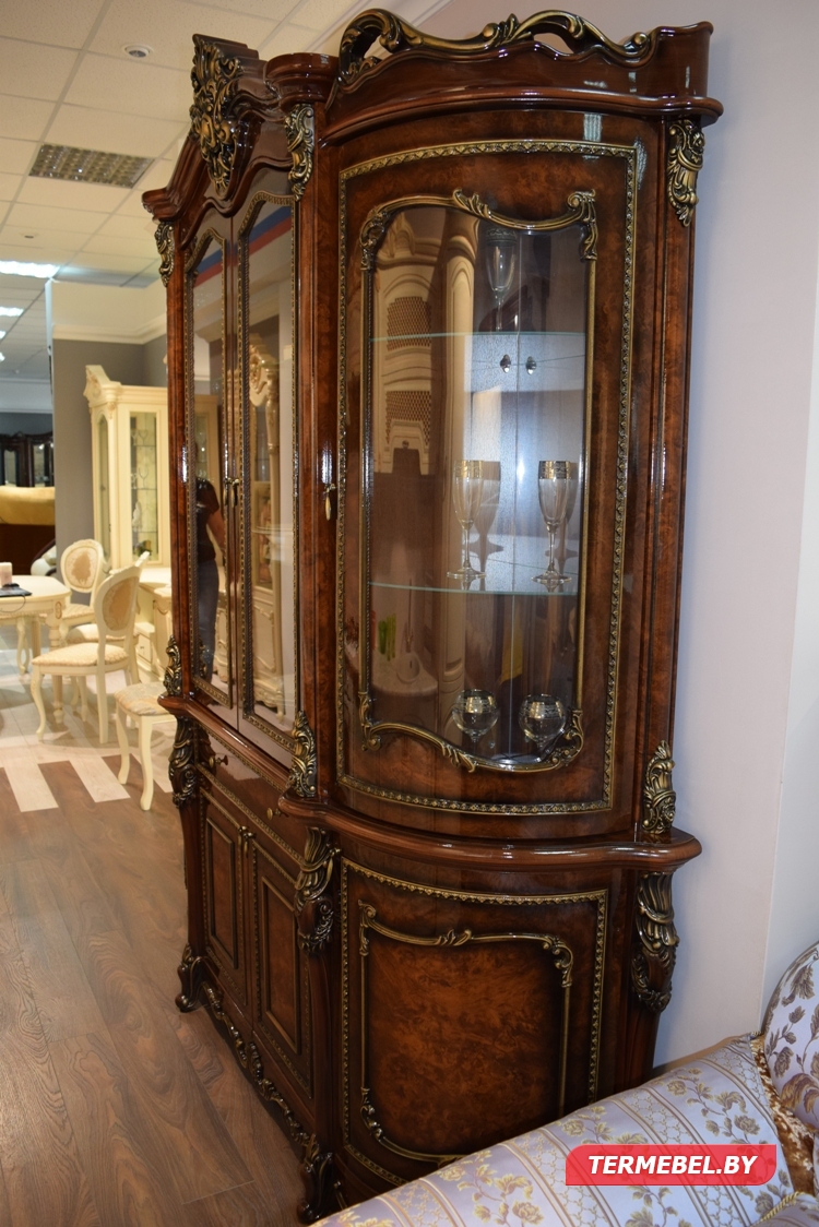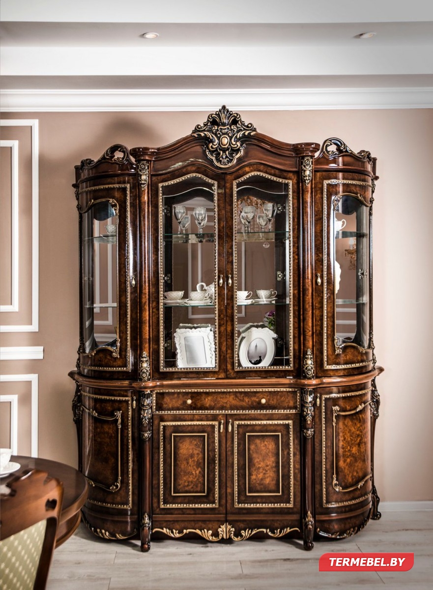 - Декоративные элементы, фасады, накладки покрыты золотой, темной патиной и матовым лаком