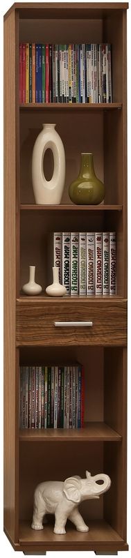 Узкий шкаф для книг с выдвижным ящиком в центральной части. Это стеллаж без створок с полками одинаковой высоты, изготавливаемый в коричневой расцветке.