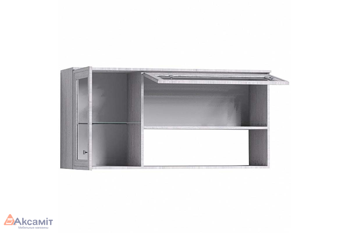 Дополнительное место для хранения книг или предметов украшения интерьера - габаритная полка с нишей под отделением с подъемной дверцей и левым отделением со стеклополкой за распашной дверцей. Фасады шкафа выполнены из тонированного серого стекла в обрамлении рельефного профиля и оснащены оригинальными металлическими ручками. Ниша и отделение с подъемной дверцей выдерживают максимальную нагрузку по 8 кг. Стеклополка регулируется по высоте и выдерживает нагрузку до 5 кг. Подъемная дверца оснащена газ-лифтом. Шкаф крепится к стене за подвесы и обязательно соединяется с соседними шкафами межсекционной стяжкой.