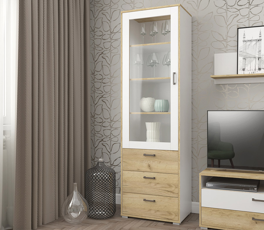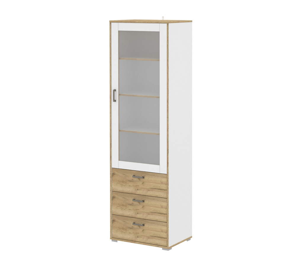 Шкаф с витриной представляет собой элегантное сочетание белого платинум и золотистого дуба. Он станет стильным дополнением к любому интерьеру, будь то гостиная, спальня или прихожая.