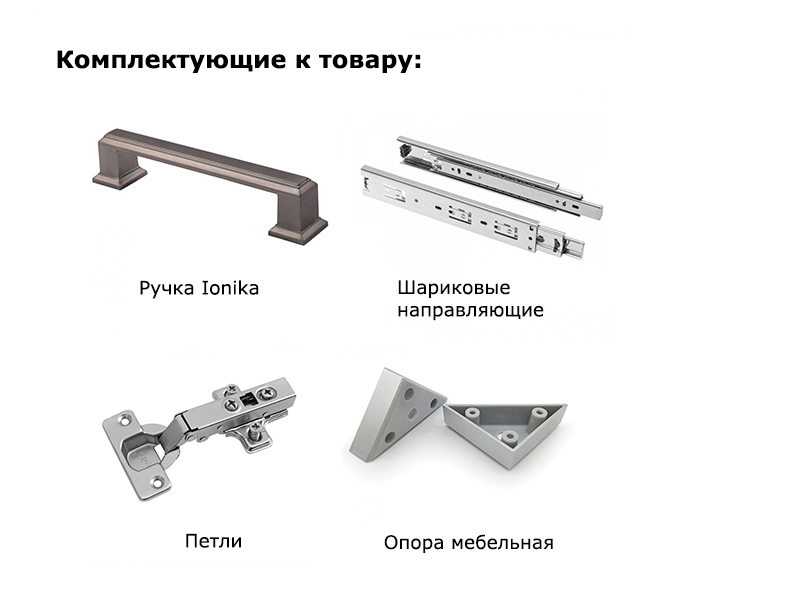 Фурнитура: ручка «Ionika» металлическая (шлифованный титан) 96 мм, шариковые направляющие, опоры мебельные, петли.