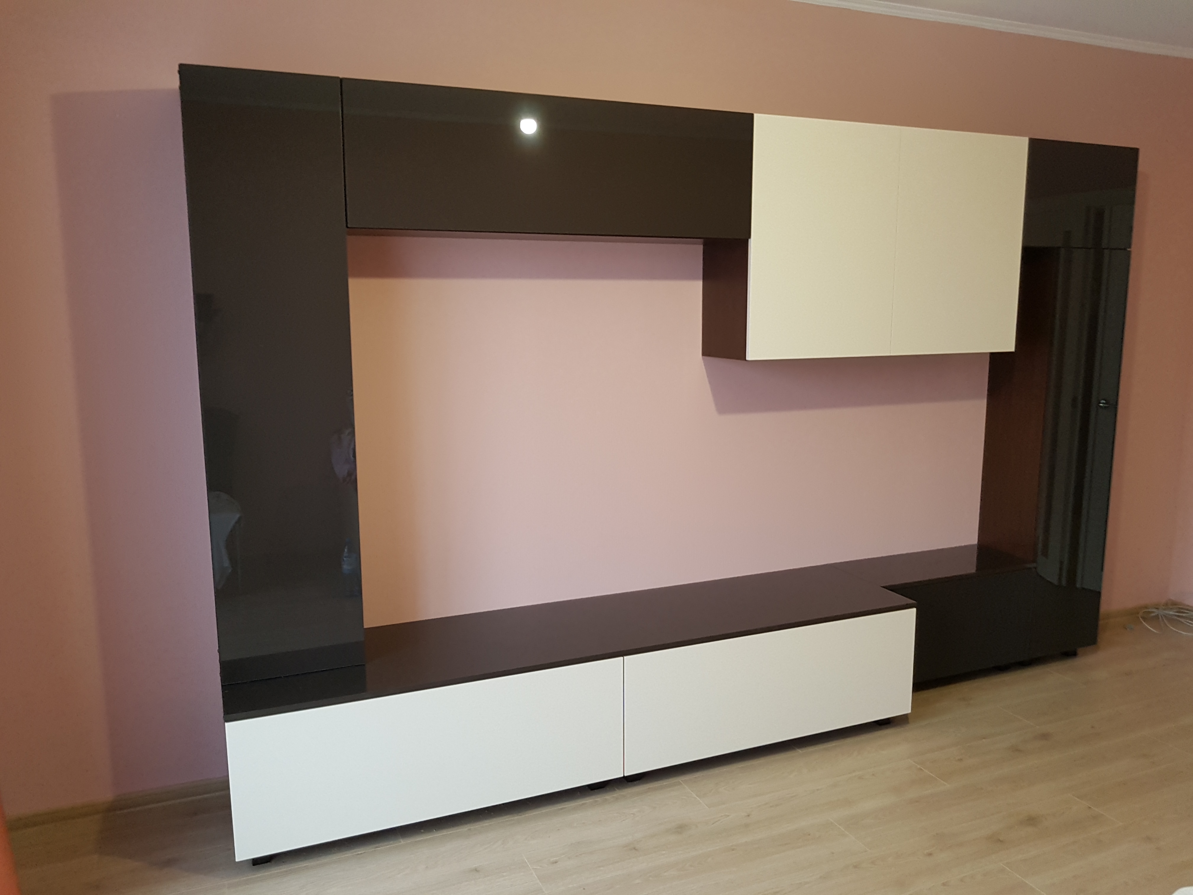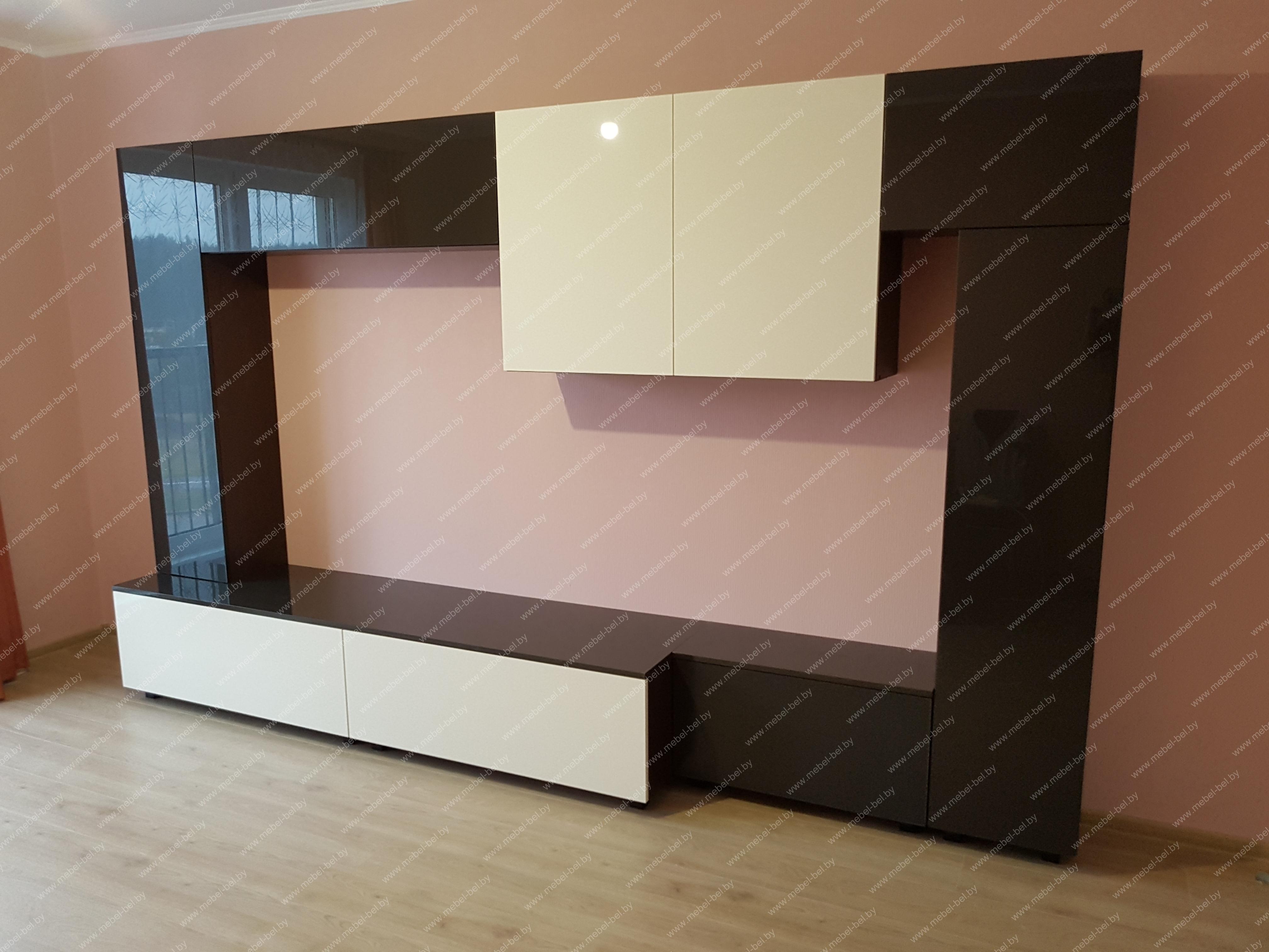 Вместительная модель со светлыми фасадами. Ниша для ТВ, открытые и закрытые секции, выдвижные ящики.