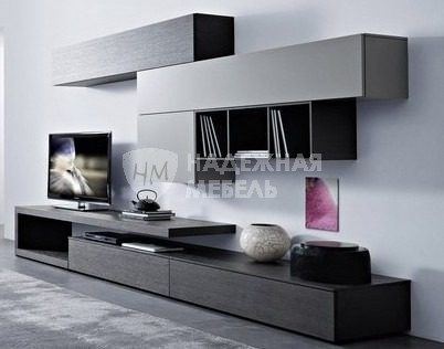 Серые фасады, широкая ТВ тумба, подвесные модули с нишами.