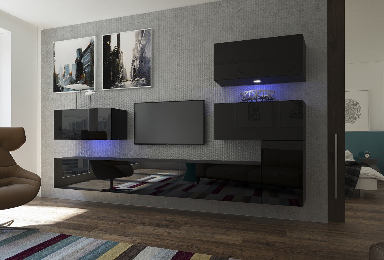 Строгая стенка модульного типа. Простая конструкция для интерьера в современном стиле, состоящая из трех сегментов, которые можно располагать на свое усмотрение. Фасады исполнены идеально ровно, на них нет ручек, а открываются ящики нажатием.