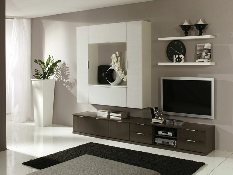 Стенка с современным дизайном отличается небольшими размерами. Такая модель будет превосходно смотреться не только в гостиной, но также и спальне. Фасад представлен сочетанием двух оттенков. Имеется ниша для телевизора с большим экраном.