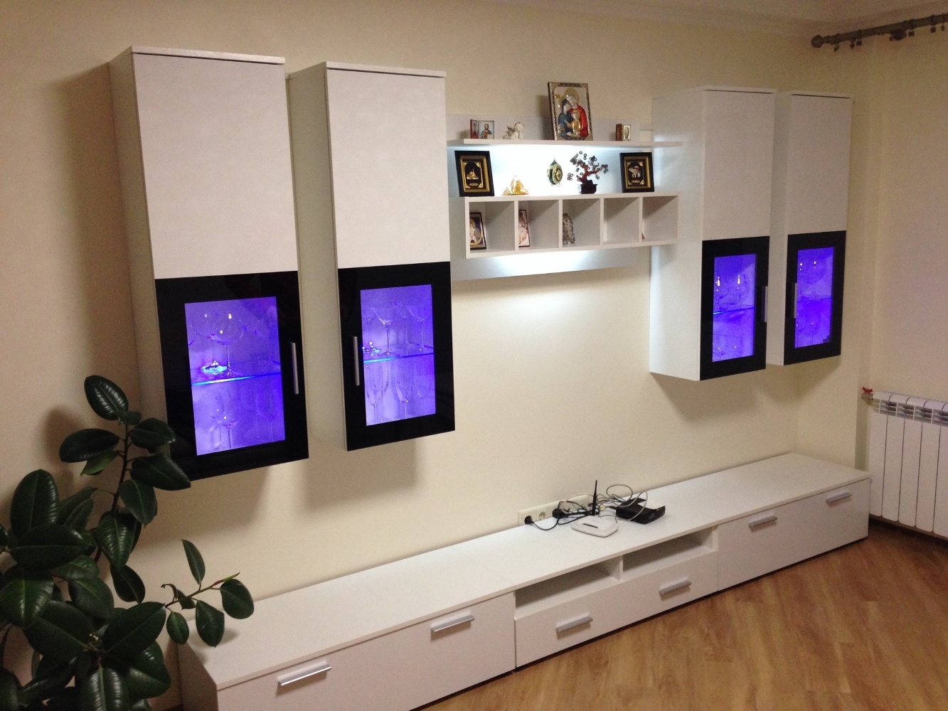код 91239Подвесные шкафчики с внутренней подсветкой стеклянных полок. Тумба с нишами для аппаратуры.