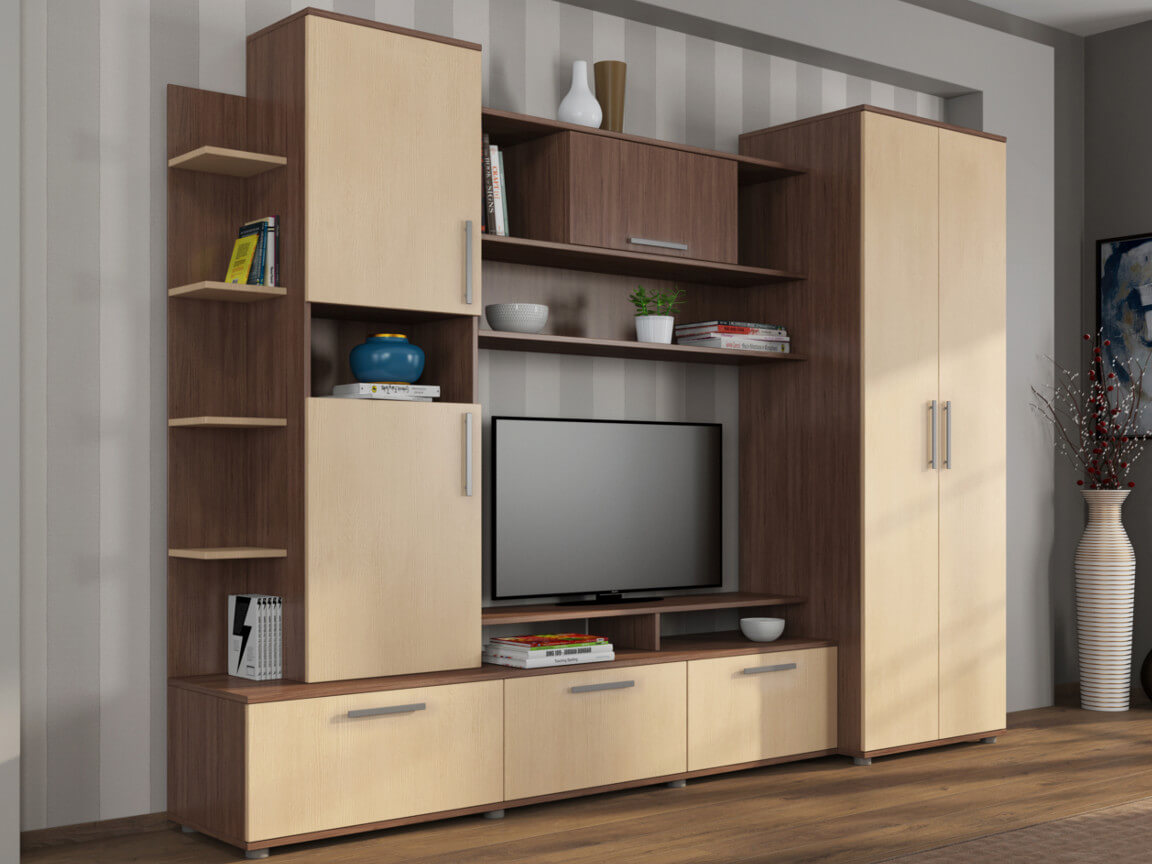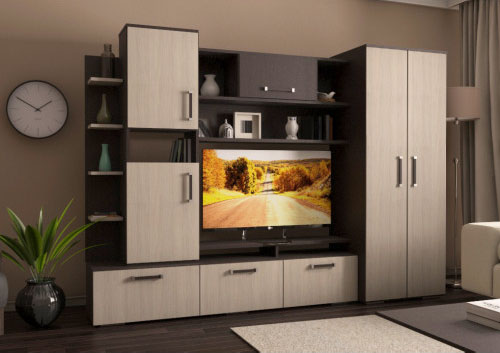 Нижний модуль включает две вместительных распашных ниши и аккуратный шкафчик на две полки.