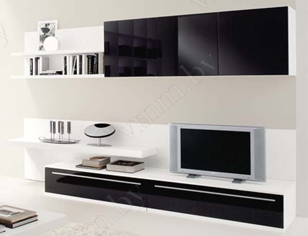 Стенка состоит из двух блоков. Первый блок это длинная тумба под телевизор. Второй - закрытые полочки, прикрепленные на стенке.