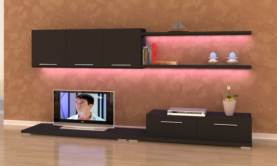 Нижний модуль представляет собой низкую тумбу с закрытыми нишами для хранения и изкой подставкой под ТВ. С помощью уровней выделены разные по назначению зоны.