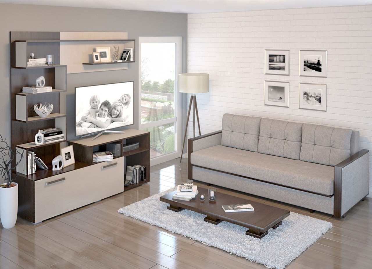 - Компактная модель: стенка не занимает много места, но при этом позволяет разместить все необходимые предметы интерьера.