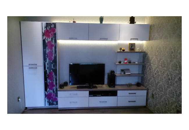 Стенка для гостиной оборудована подсветкой в верхних подвесных шкафчиках. Боковая панель оснащена красочным изображением цветов. Также в комплекте поставляются три полочки.