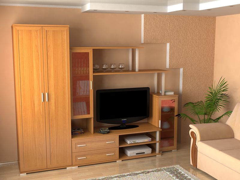 код 103675Функциональная стенка с нишей для тв, открытыми полками, ящиками и двустворчатым шкафом.