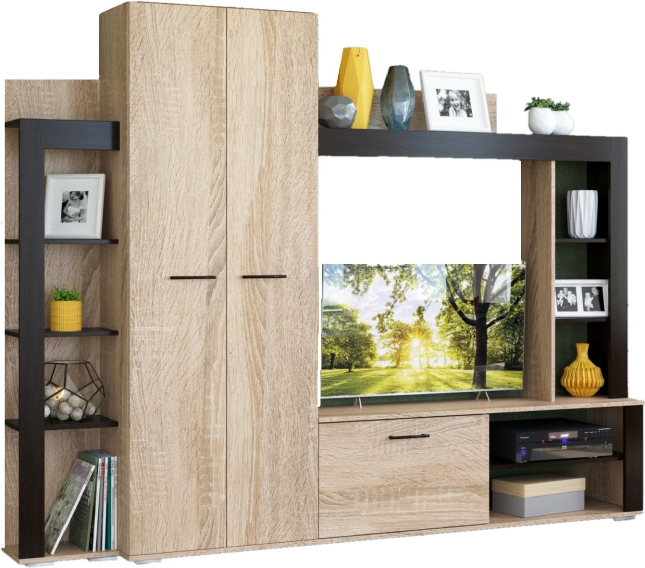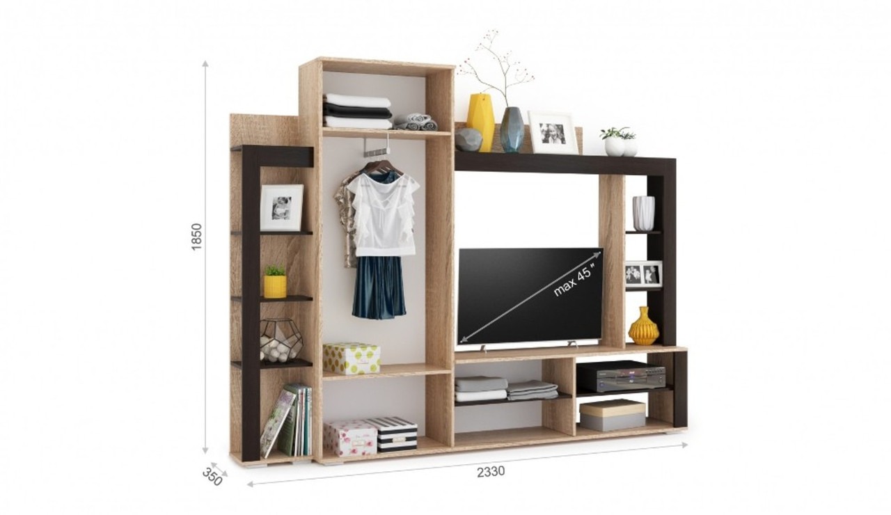 Гостиная "Торонто" - оригинальный дизайн, вместительность и небольшие габариты. Занимая мало места по глубине и ширине, она включает в себя платяной шкаф с штангой, нишу под ТВ и множество полок для приставок, колонок, книг и декора. Использование популярных цветов Дуб сонома и Венге даёт возможность легко сочетать эту стенку в гостиной с другими предметами мебели столами, журнальными столиками, стеллажами или комодами. Выполнена из экологичных материалов.