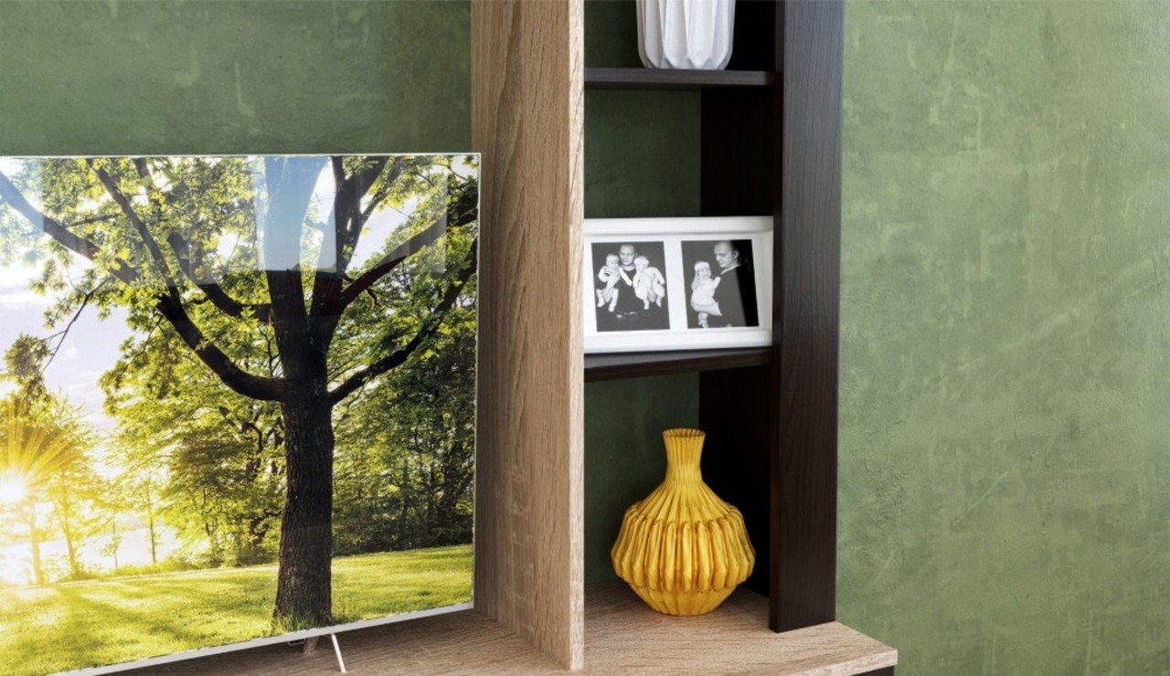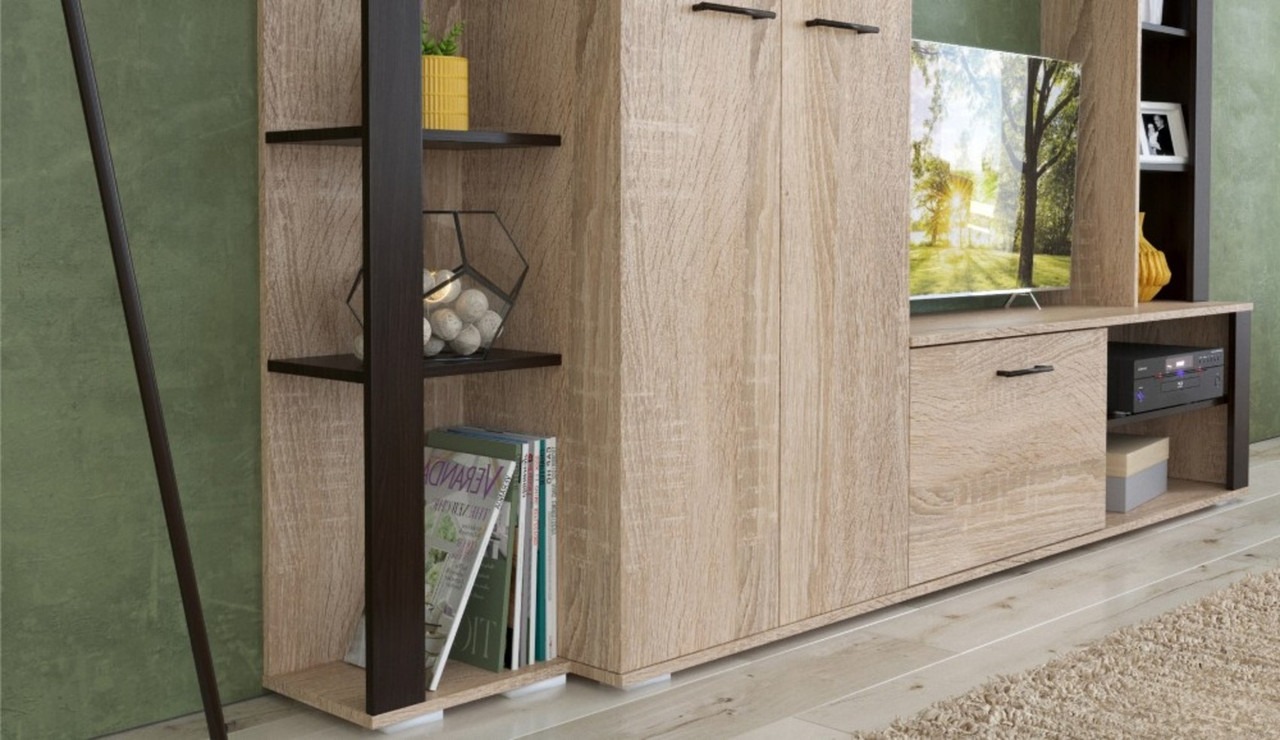 Удачная планировка - стенка совмещает компактность и функциональность - при небольших размерах Мебель содержит необходимые для гостиной элементы - ниша для ТВ, открытые полки, шкаф с металлической штангой, стеллаж.