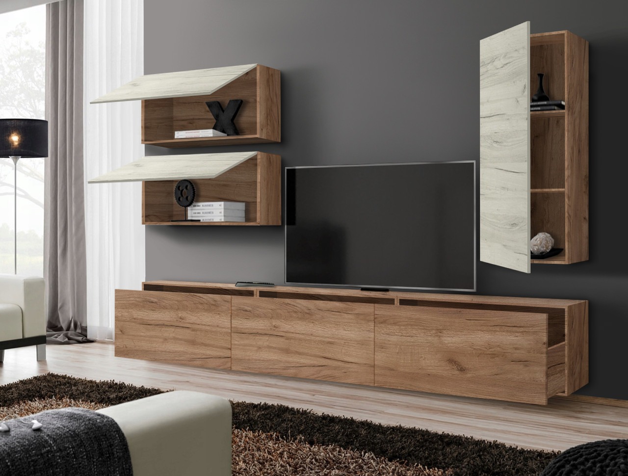Современная стенка в гостиную с нишей для ТВ, выдвижными ящиками, распашными шкафчиками и открытыми полками.