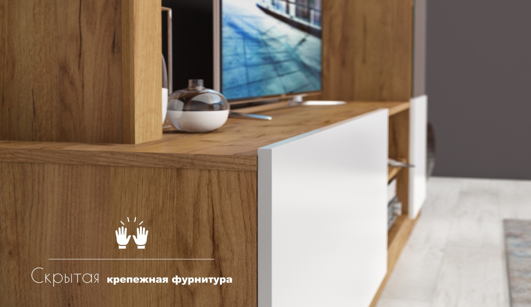Размеры: 2400х450х2030 мм. Широкая тумба для ТВ. Разноуровневые модули.
