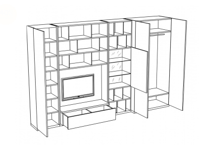 Функциональная стенка «Accent 3» состоит из множества полочек-ниш, секций и шкафа, что дает возможность без проблем разместить книги, посуду, аудио- и видеотехнику. Все модули открываются по системе «нажал-открыл».