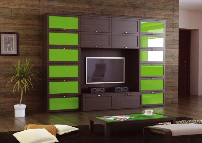 Фасады стенки выполнены в цвете темного ореха с глянцевыми вставками салатового оттенка. Легкий отблеск фасадов придают предмету мебели современный внешний вид. Модель представляет собой широкую раму с просторной нишей для ТВ в центре.