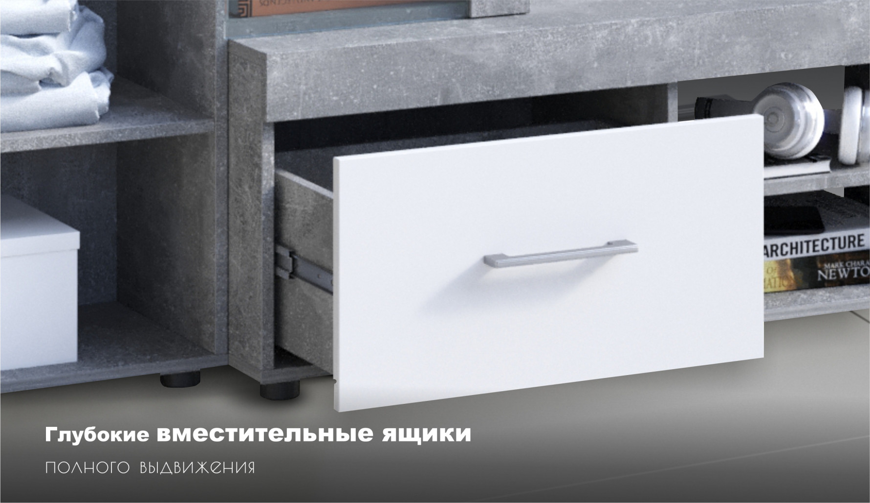 Коллекция модульной мебели с белыми глянцевыми фасадами для гостиной. Материал: МДФ, ЛДСП.