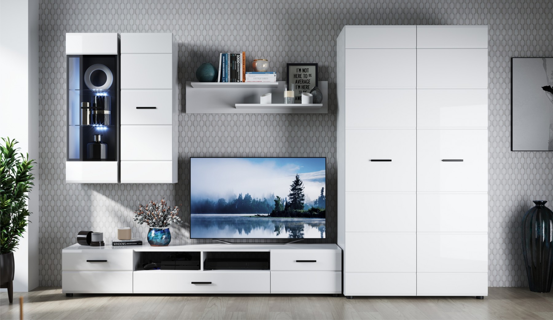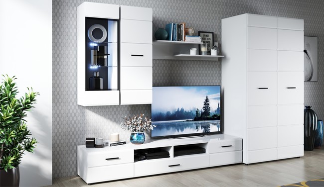 Модульная система Йорк выполнена в стиле минимализма. Строгие, лаконичные линии подчеркивают элегантность комплекта. Белый цвет мебели с деталями глубокого черного визуально сделает комнату светлее, просторнее и позволит составить безупречный по стилю комплект мебели. Сочетание глянцевой и стеклянной поверхностей, открытых полок создадут уютную обстановку и позволят украсить убранство комнаты приятными мелочами и разместить любимые книги и фото. Светодиодная подсветка придаст индивидуальность Вашей мебели. А широкая тумба для ТВ с выдвижными ящиками на телескопических направляющих позволит удобно разместить телевизор любой диагонали и другие медиаустройства Модульная система позволит подобрать по размеру вариант именно для Вашей комнаты, не оглядываясь на фиксированный размер, как в других стенках. Мебель выполнена из экологически безопасных материалов.