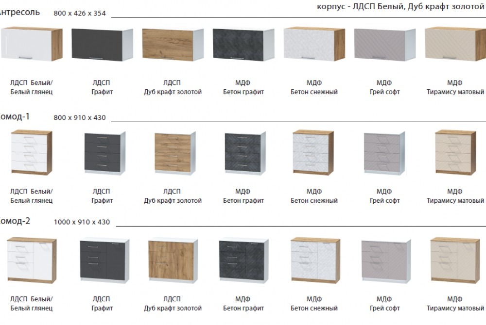 Фасады ЛДСП: дуб крафт золотой, графит, белый, белый глянец