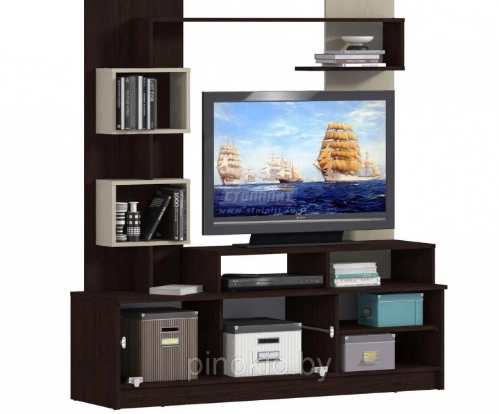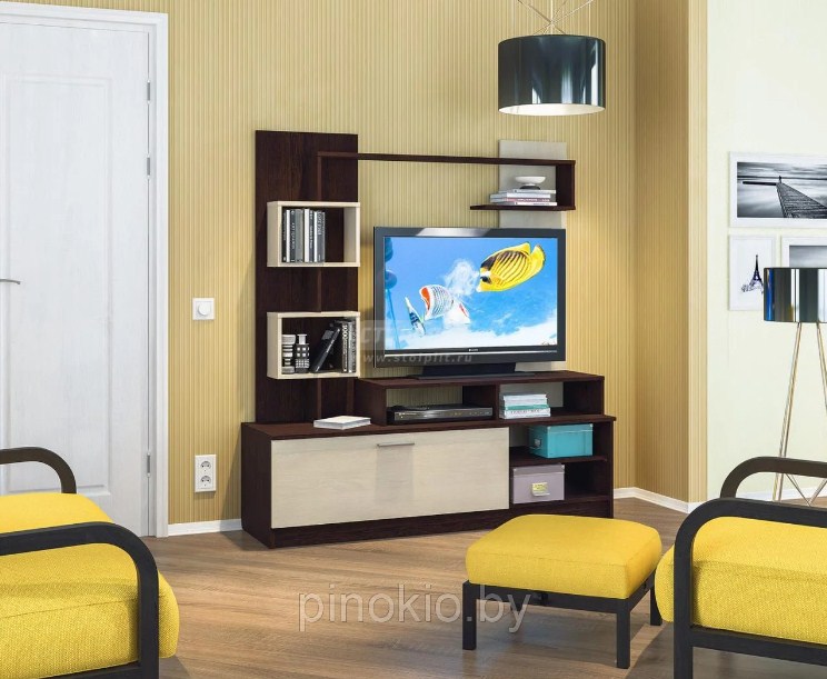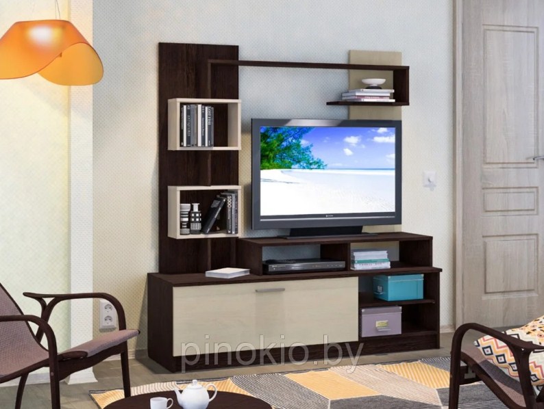 Контрастное сочетание цветов. Подвесная тумба для ТВ, витрина и два пенала.