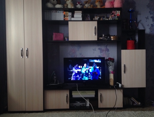 Размер ниши под ТВ – 1300х823 мм. Распашной шкаф с полками.