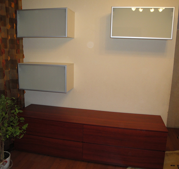 Сочетание теплых оттенков, разноуровневые модули, скрытая крепежная фурнитура. Размеры: 2400х450х2030 мм.