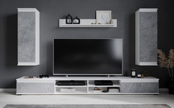 Стенка для гостиной или спальни отличается своим привлекательным внешним видом и компактными размерами. Нижний ряд представлен в виде прямоугольной тумбы под ТВ, а верхний ряд оснащен несколькими подвесными шкафчиками. Отличительной особенностью модели является полное отсутствие дверных ручек, которые заменены современной системой.