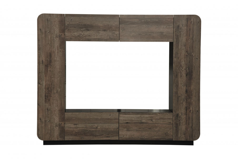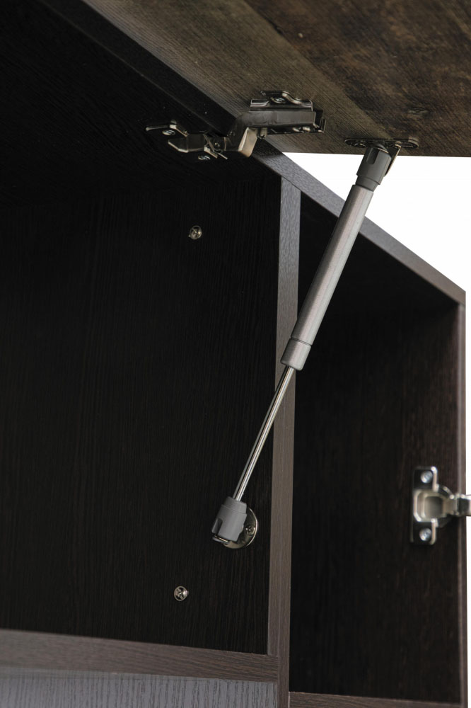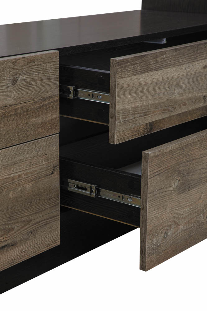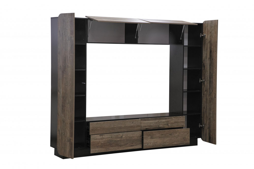 Стенка, выполненная в темно-коричневых тонах, прекрасно допонлит современный интерьер. В нижней части конструкции есть четыре выдвижных ящика на шариковых направляющих и два больших отделения вверху, которые комплектуются газлифтами. Каждая из боковых секций включает по пять полок.