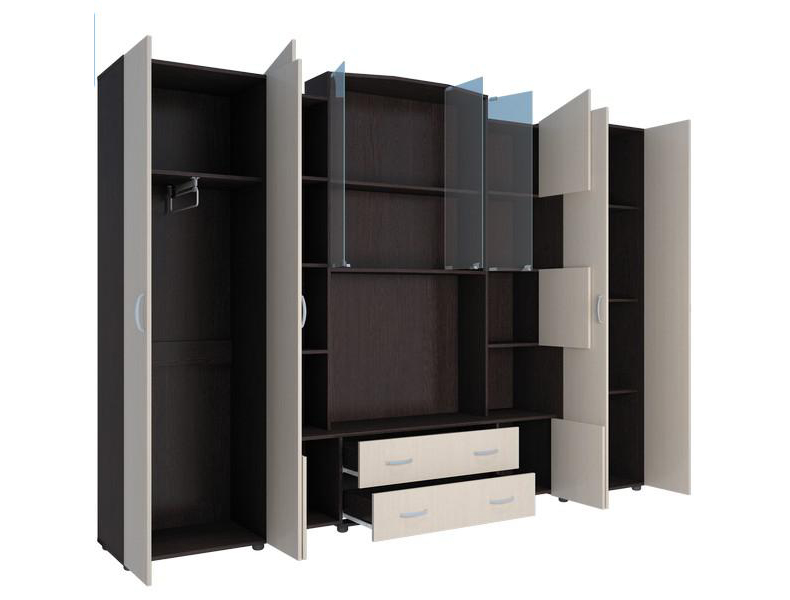 код 116522Два распашных шкафа по бокам. Наполнение: выдвижная вешалка и полки.
