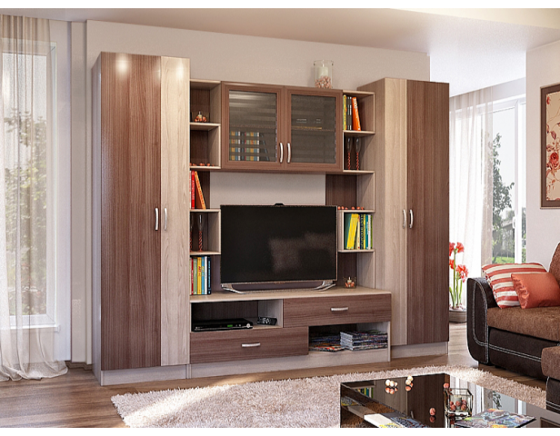 Два остекленных стеллажа, ТВ-тумба, комод, журнальный стол, подвесные полки.