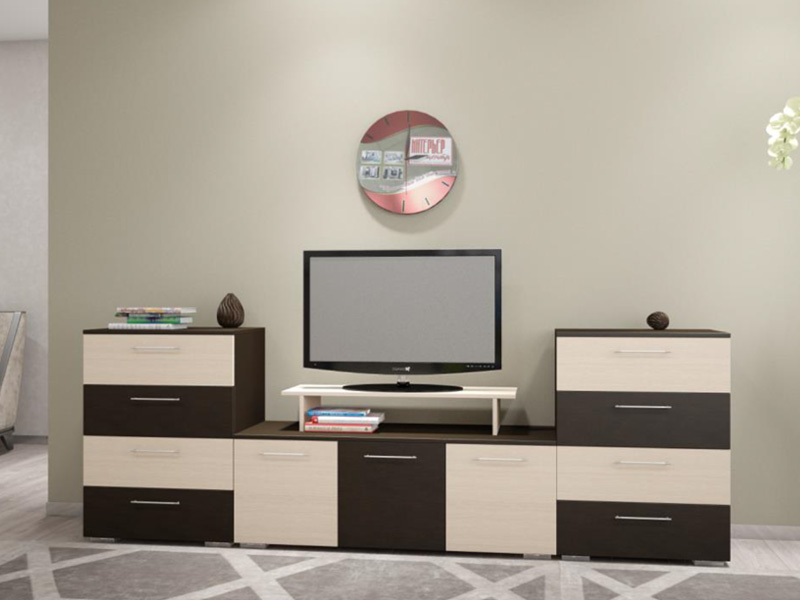 Функциональная стенка с современным дизайном. Темно-светлые фасады.