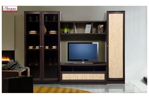 Стенка под телевизор с большим количеством полок и закрытых дверцами отделений.