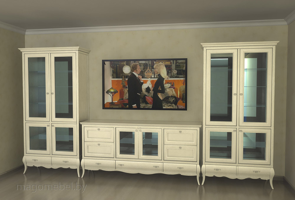 Материал: массив дерева. Стеклянные фасады. Тумба под ТВ.