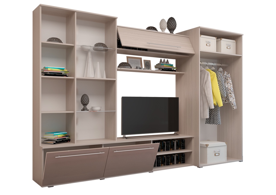 Стенка «Монако» - это достойная модель для современного интерьера. Конструкция гарнитура проста на первый взгляд и очень стильна за счет своей миниматистичности. Фасады украшены широкими стеклянными и глянцевыми вставками. В центральной части модели имеется ниша для ТВ. Гармоничность форм подчеркивается прекрасным выбором сочетающихся друг с другом оттенков: глянцевая лакированная отделка цвета какао и благородный ясень шимо светлый.