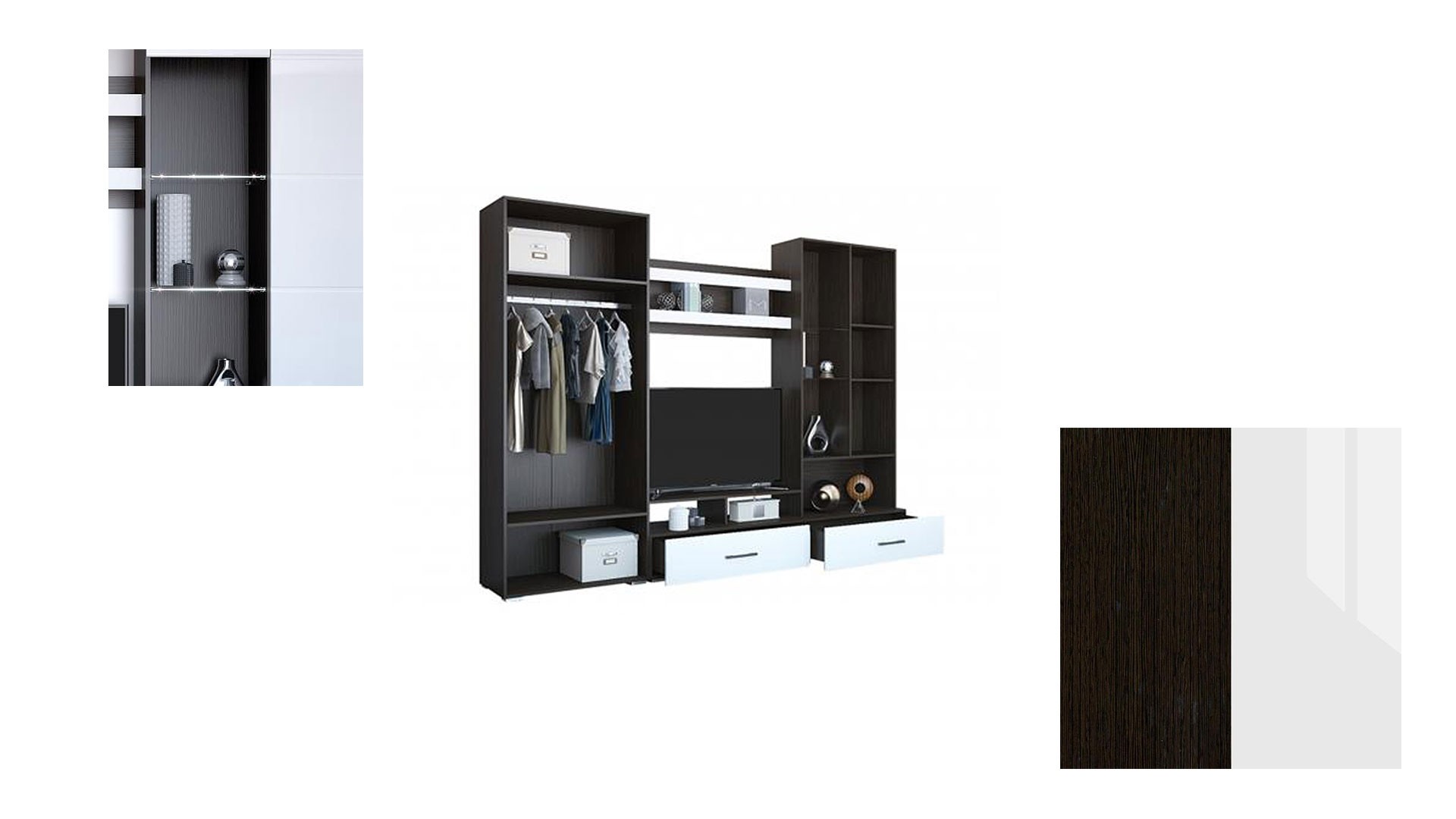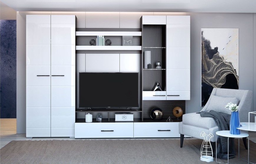 код 105027Современная стенка с белыми глянцевыми фасадами. Функциональные модули.