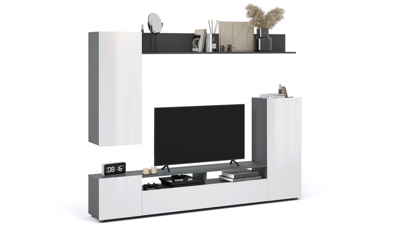 Мини-стенка «Нео» — современное, функциональное решение для гостиной, поможет рационально обустроить комфортную зону для отдыха и просмотра TV. Большая ниша для телевизора, закрытые шкафчики и открытые полки вместят в себя всё самое необходимое. Корпус выполнен в модном антрацитовом цвете, который подчеркивает простые и легкие геометрические формы стенки. Белые глянцевые фасады создают гармонию, свет и уют.