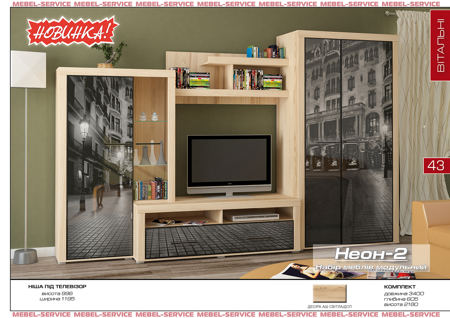 Фасад стенки «Неон-2» украшен фотопечатью с видом ночной улицы города. Светлый корпус предмета мебели органично сочетается с декором и выглядит как большая рамка для большой фотографии. Имеется широкая ниша для ТВ.