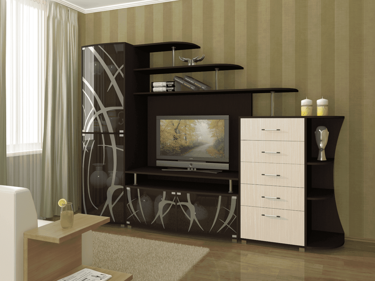 Асимметричная стенка с фасадами из темного стекла, украшенного пескоструйным рисунком. Модель оснащена открытыми полками и 5 выдвижными ящиками.